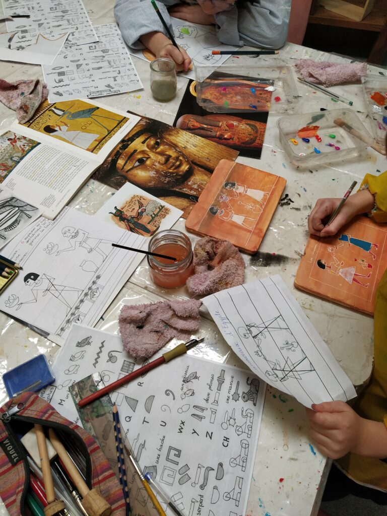 Le cours est structuré comme un voyage chronologique à travers l’histoire de l’Art. À chaque séance, votre enfant découvre un grand courant artistique (de la Préhistoire au Pop Art), apprend ses principes fondamentaux et s’approprie la technique emblématique associée. Par exemple pour la préhistoire, grâce à de nombreux supports visuels, l’enfant découvre l’art pariétal en expérimentant les mélanges de pigments naturels. Nous voyagerons ainsi de l’Egypte antique au cubisme en passant par le moyen-âge.